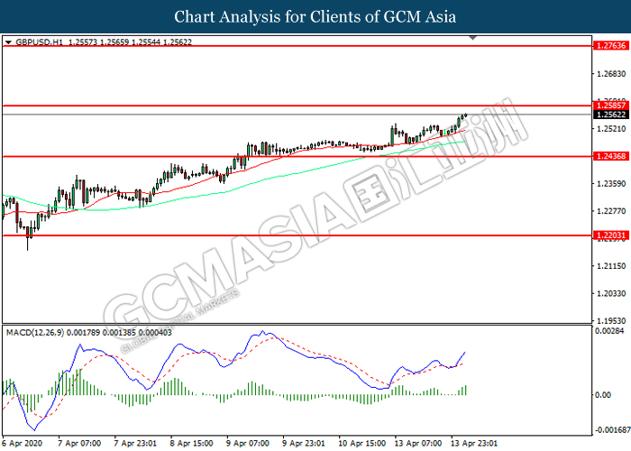 GBPUSD, H1: GBPUSD was traded higher while currently near the resistance level at 1.2585. MACD which illustrated increasing bullish momentum suggest the pair to extend its gains after it successfully breakout above the resistance level.