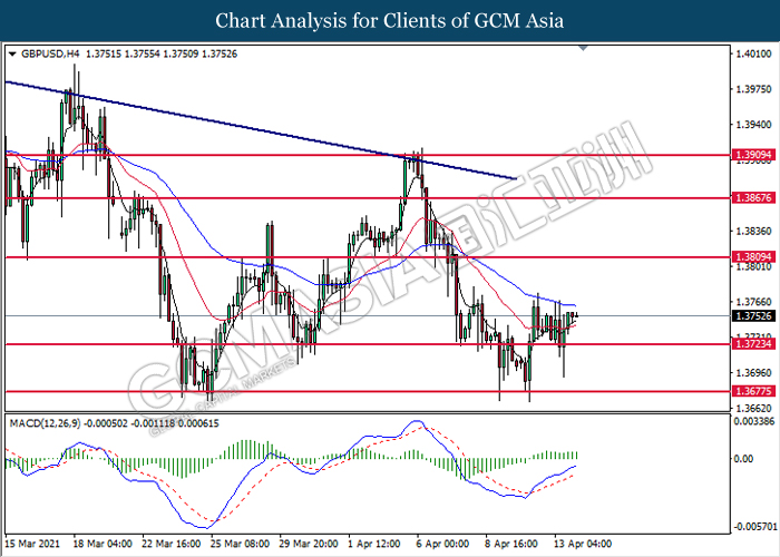 GBPUSD, H4: GBPUSD was traded higher following prior rebound from the support level at 1.3725. MACD which illustrated bullish bias momentum suggest the pair to extend its gains toward the resistance level at 1.3810.