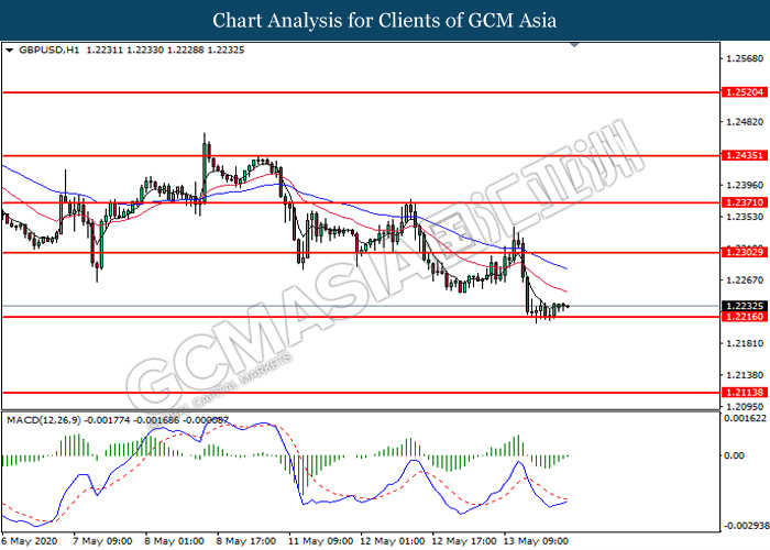 GBPUSD, H4: GBPUSD was traded higher following prior rebound from the support level at 1.2215. MACD which illustrates diminishing bearish momentum suggest the pair to extend its gains toward the resistance level at 1.2305.