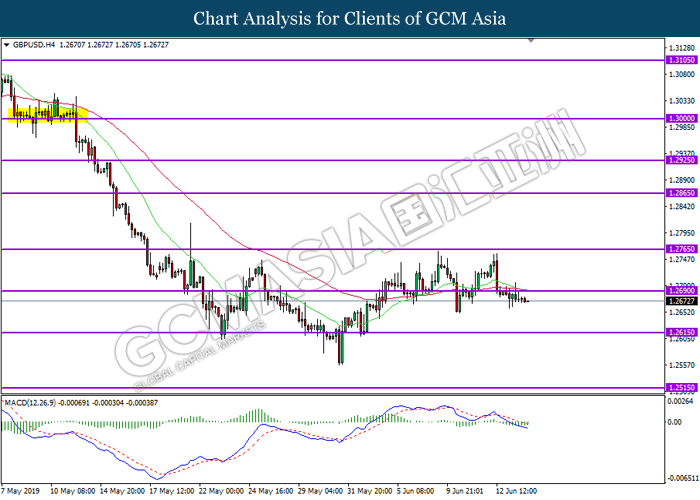 GBPUSD, H4: GBPUSD was traded flat after retracing from the resistance level 1.2690. MACD which illustrate ongoing bearish momentum suggest the pair to be traded lower towards the support level 1.2615.