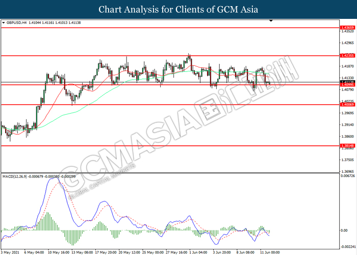 GBPUSD, H4: GBPUSD was traded lower while currently testing the support level at 1.4100. MACD which illustrated increasing bearish momentum suggest the pair to extend its losses after it successfully breakout below the support level.
