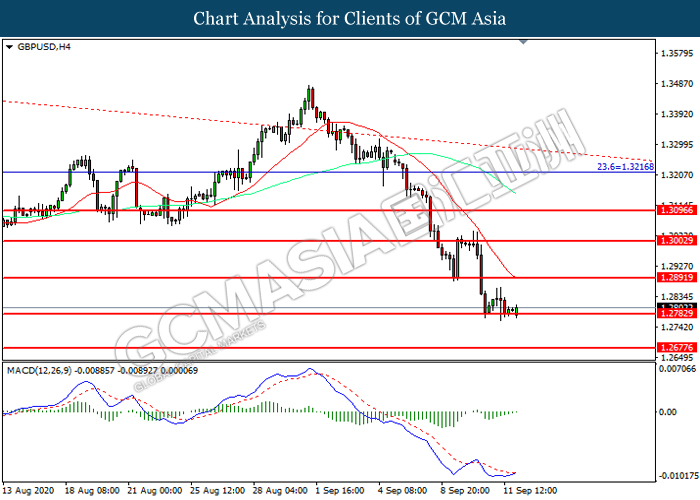 GBPUSD, H4: GBPUSD was traded lower while currently testing the support level at 1.2785. However, MACD which illustrated diminishing bearish momentum suggest the pair to be traded higher in short-term as technical correction.