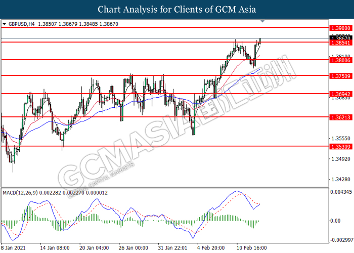 GBPUSD, H4: GBPUSD was traded higher while currently testing the resistance level at 1.3855. MACD which illustrated diminishing bearish momentum suggest the pair to extend its gains after it successfully breakout above the resistance level.