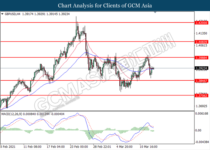 GBPUSD, H4: GBPUSD was traded higher following prior rebound from the lower level. MACD which illustrated diminishing bearish momentum suggest the pair to extend its gains toward the resistance level at 1.3990.