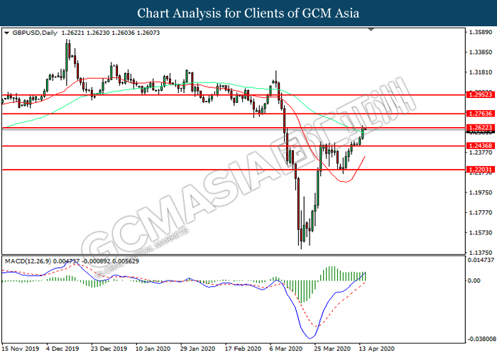 GBPUSD, Daily: GBPUSD was traded higher while currently near the resistance level at 1.2620. MACD which illustrated increasing bullish momentum suggest the pair to extend its gains after it successfully breakout above the resistance level.