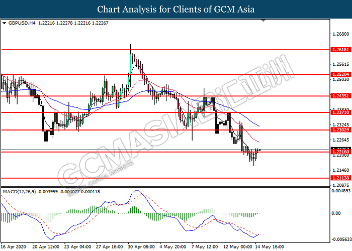 GBPUSD, H4: GBPUSD was traded higher following prior breakout above the previous resistance level at 1.2215. MACD which illustrates diminishing bearish momentum suggest the pair to extend its gains toward the resistance level at 1.2305.