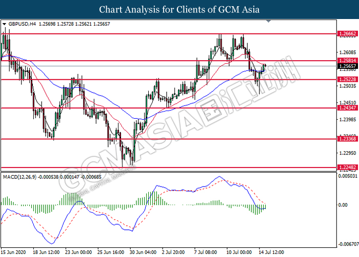 GBPUSD, H4: GBPUSD was traded higher following prior rebound from the support level at 1.2525. MACD which illustrate diminishing bearish momentum suggest the pair to extend its gains toward the resistance level at 1.2580.