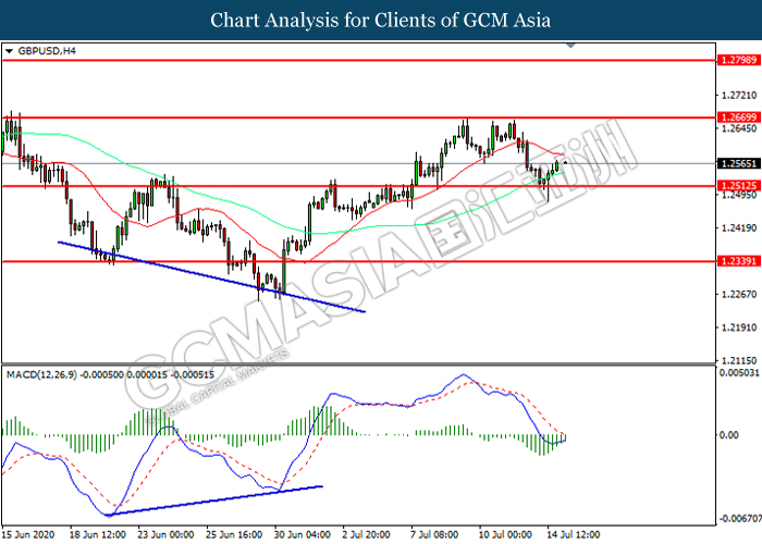 GBPUSD, H4: GBPUSD was traded higher following prior rebound from the support level at 1.2515. MACD which illustrated diminishing bearish momentum suggest the pair to extend its gains toward resistance level at 1.2670.
