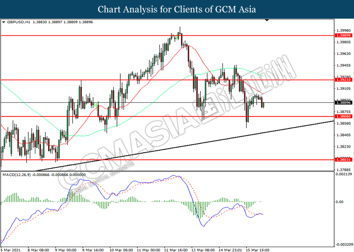 GBPUSD, H1: GBPUSD was traded lower while currently near the support level at 1.3870. However, MACD which illustrated diminishing bearish momentum suggest the pair to be traded higher in short-term as technical correction.