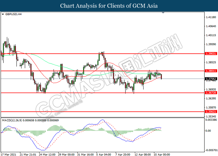 GBPUSD, H4: GBPUSD was traded lower following prior retracement from the resistance level at 1.3800. MACD which illustrated diminishing bullish momentum suggest the pair to extend its losses toward support level at 1.3675.