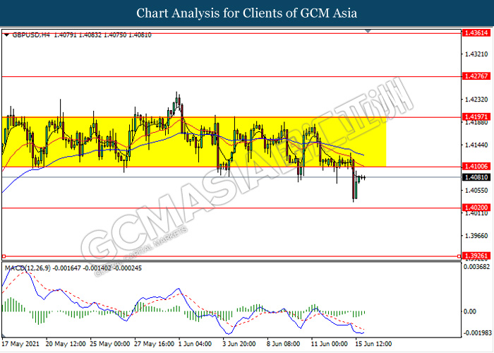 GBPUSD, H4: GBPUSD was traded higher following prior rebound from its low level. MACD which illustrate diminishing bearish momentum signal suggest the pair to extend its rebound in short term towards the resistance level 1.4100.
