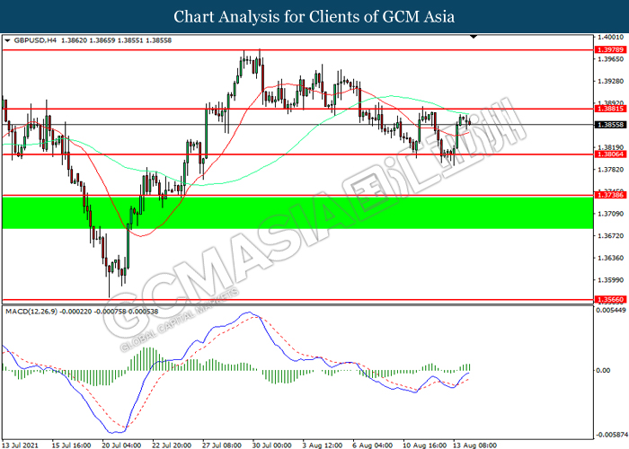 GBPUSD, H4: GBPUSD was traded higher while currently testing the resistance level at 1.3880. MACD which illustrated increasing bullish momentum suggest the pair to extend its gains after it successfully breakout above the resistance level.