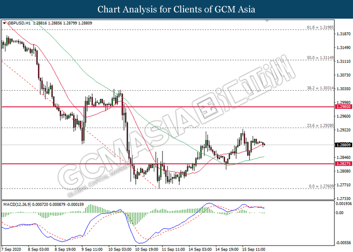 GBPUSD, H1: GBPUSD was traded lower following prior retrace from its higher level. MACD which illustrate negative divergence signal suggests the pair to be traded lower in short-term.