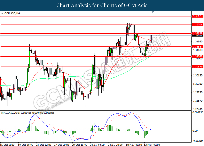 GBPUSD, H4: GBPUSD was traded higher while currently testing the resistance level at 1.3225. MACD which illustrated diminishing bearish momentum suggest the pair to extend its gains after it successfully breakout above the resistance level.