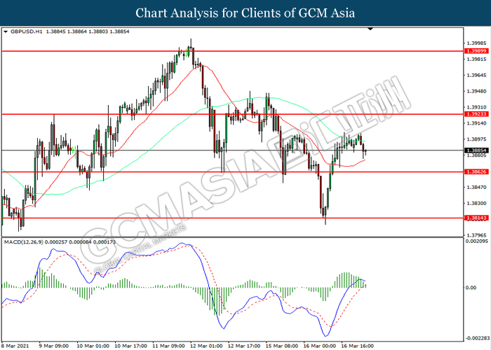 GBPUSD, H1: GBPUSD was traded higher following prior breakout above the previous resistance level at 1.3865. However, MACD which illustrated diminishing bullish momentum suggest the pair to be traded lower in short-term as technical correction.