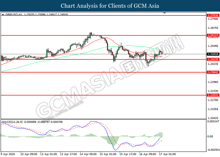 GBPUSD, H1: GBPUSD was traded higher following prior rebound from the support level at 1.2455. However, MACD which illustrated diminishing bullish momentum suggest the pair to be traded lower in short-term as technical correction.