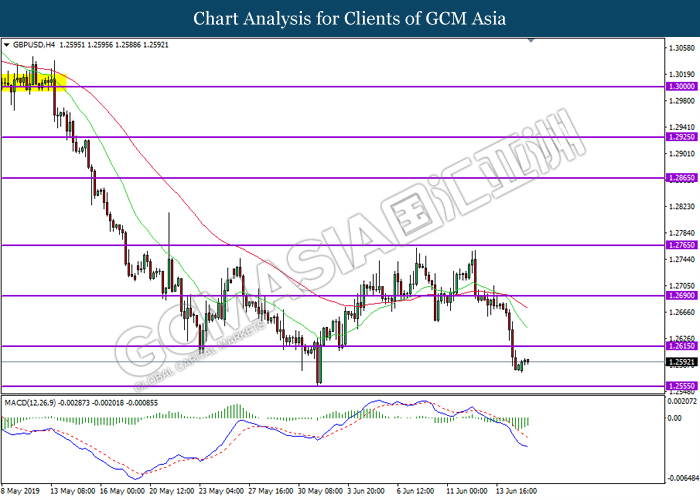 GBPUSD, H4: GBPUSD was traded higher following prior rebound from its lower level. MACD which illustrate diminished downward momentum suggests the pair to be traded higher in short-term as technical correction.