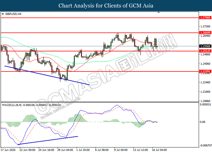 GBPUSD, H4: GBPUSD was traded lower following prior retracement from the resistance level at 1.2670. However, MACD which illustrated diminishing bearish momentum suggest the pair to be traded higher in short-term as technical correction.