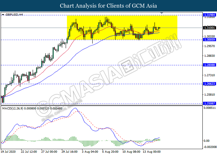 GBPUSD, H4: GBPUSD remain traded in a sideway channel. However, MACD which illustrate bullish bias signal suggest the pair to be traded higher towards the resistance level 1.3200.