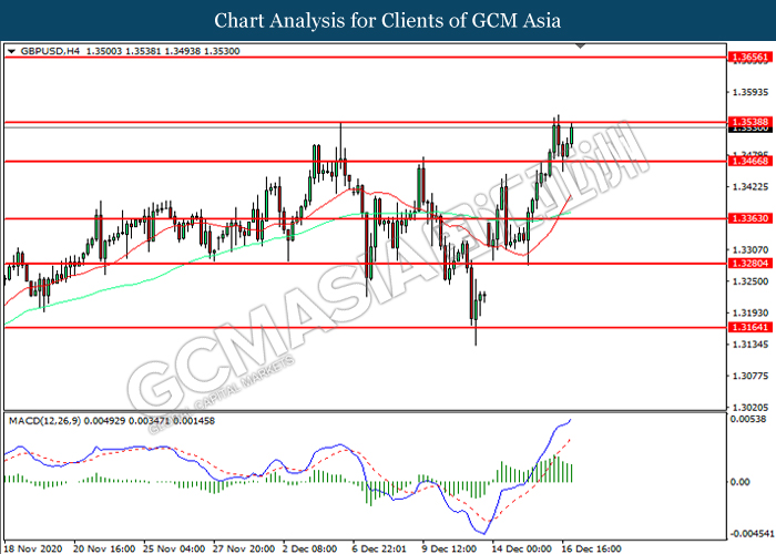 GBPUSD, H4: GBPUSD was traded higher while currently testing the resistance level at 1.3540. However, MACD which illustrated diminishing bullish momentum suggest the pair to be traded lower in short-term as technical correction.