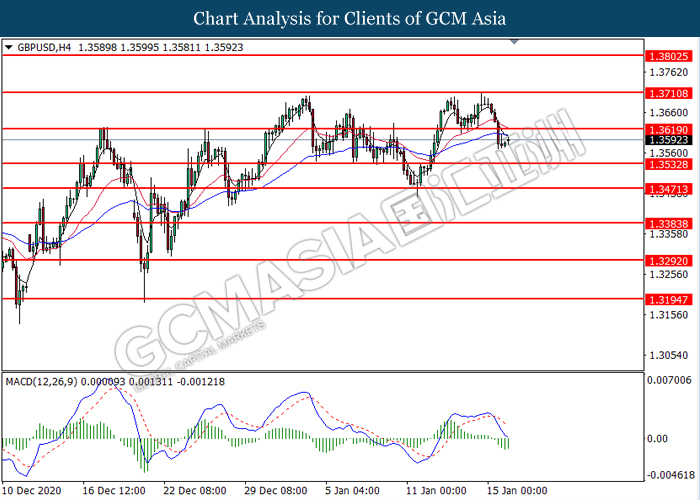 GBPUSD, H4: GBPUSD was traded higher following prior rebound from the lower level. MACD which illustrated diminishing bearish momentum suggest the pair to extend its gains toward the resistance level at 1.3620.