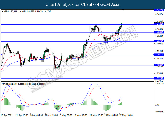 GBPUSD, H4: GBPUSD was traded higher while currently testing the resistance level 1.4165. MACD which illustrate bullish momentum signal with the formation of golden cross suggest the pair to extend its gains after it breaks above the resistance level 1.4165.