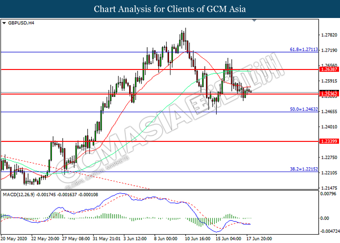 GBPUSD, H4: GBPUSD was traded lower while currently testing the support level at 1.2535. MACD which illustrated diminishing bullish momentum suggest the pair to extend its losses after it successfully breakout below the support level.