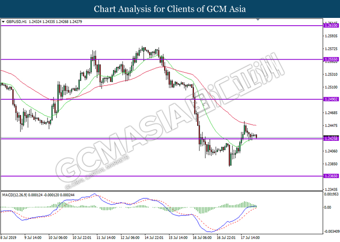GBPUSD, H1: GBPUSD was traded lower while currently testing the support level 1.2425. MACD which illustrate diminishing bullish momentum suggest the pair to extend its losses after successfully breaking below the support level.