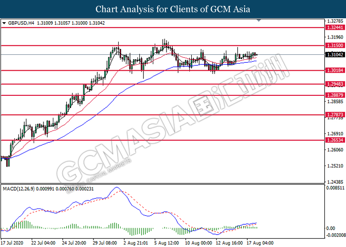 GBPUSD, H4: GBPUSD was traded higher following prior rebound from the lower level. MACD which illustrate bullish bias momentum signal suggest the pair to extend its rebound toward the resistance level at 1.3150.