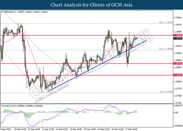 GBPUSD, H1: GBPUSD was traded higher while currently testing 1.2985. MACD which illustrate bullish signal suggests the pair to extend its gains after closing above the resistance level.
