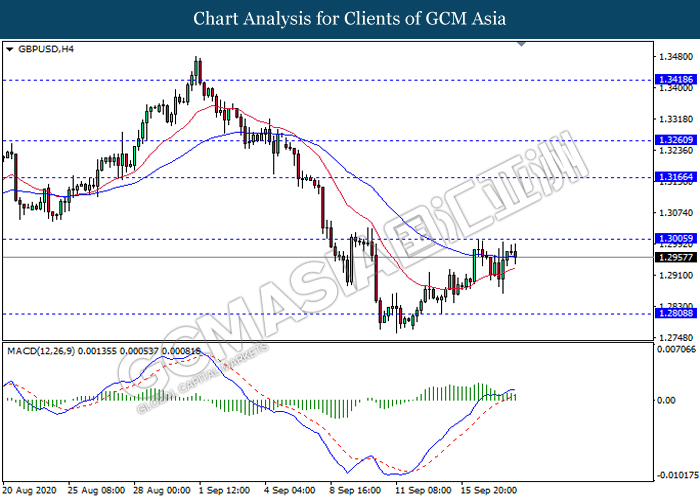 GBPUSD, H4: GBPUSD was traded higher while currently testing near the resistance level 1.3005. However, MACD which illustrate diminishing bullish momentum signal suggest the pair to experience a short term technical correction towards the support level 1.2810.
