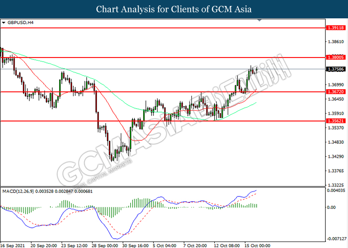 GBPUSD, H4: GBPUSD was traded higher while currently near the resistance level at 1.38005. MACD which illustrated increasing bullish momentum suggest the pair to extend its gains after it successfully breakout above the resistance level.