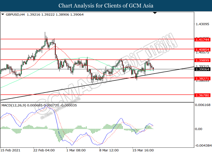 GBPUSD, H4: GBPUSD was traded lower following prior retracement from the resistance level at 1.3990. MACD which illustrated diminishing bullish momentum suggest the pair to extend its losses toward support level at 1.3825.