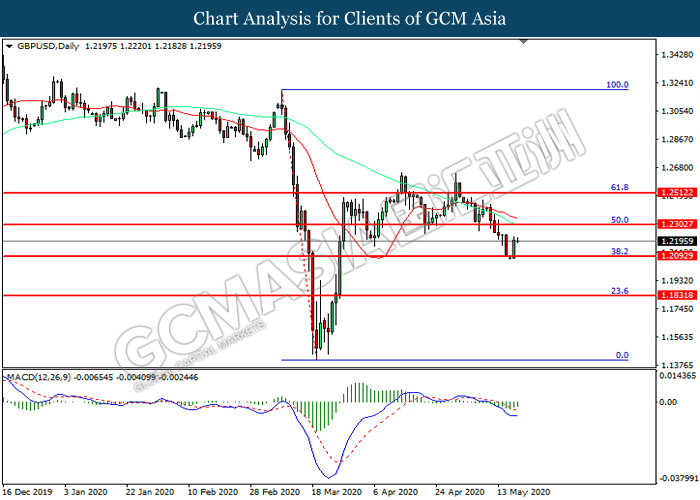 GBPUSD, Daily: GBPUSD was traded higher following prior rebound from the support level at 1.2095. MACD which illustrated diminishing bearish momentum suggest the pair to extend its gains toward resistance level at 1.2305.