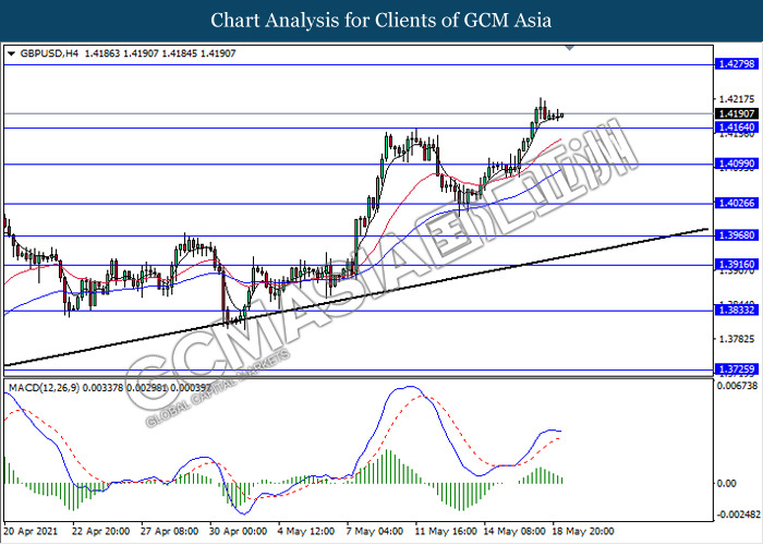 GBPUSD, H4: GBPUSD was traded flat near the support level 1.4165. However, MACD which illustrate diminishing bullish momentum signal suggest the pair to be traded lower after it breaks below the support level 1.4165.