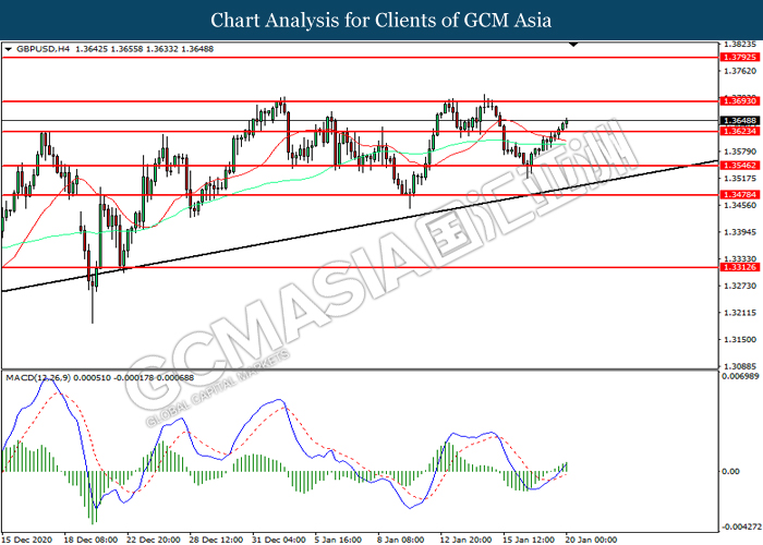 GBPUSD, H4: GBPUSD was traded higher following prior breakout above the previous resistance level at 1.3625. MACD which illustrated increasing bullish momentum suggest the pair to extend its gains toward resistance level at 1.3695.