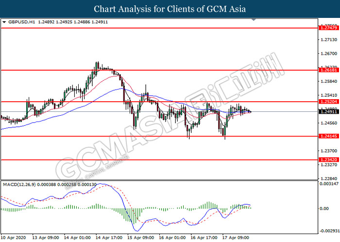 GBPUSD, H1: GBPUSD was traded lower following prior retracement from the resistance level at 1.2520. MACD which illustrate diminishing bullish momentum suggest the pair to extend its retracement toward the support level at 1.2415.