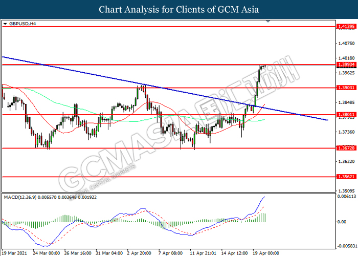 GBPUSD, H4: GBPUSD was traded higher while currently testing the resistance level at 1.3995. MACD which illustrated increasing bullish momentum suggest the pair to extend its gains after it successfully breakout above the resistance level.