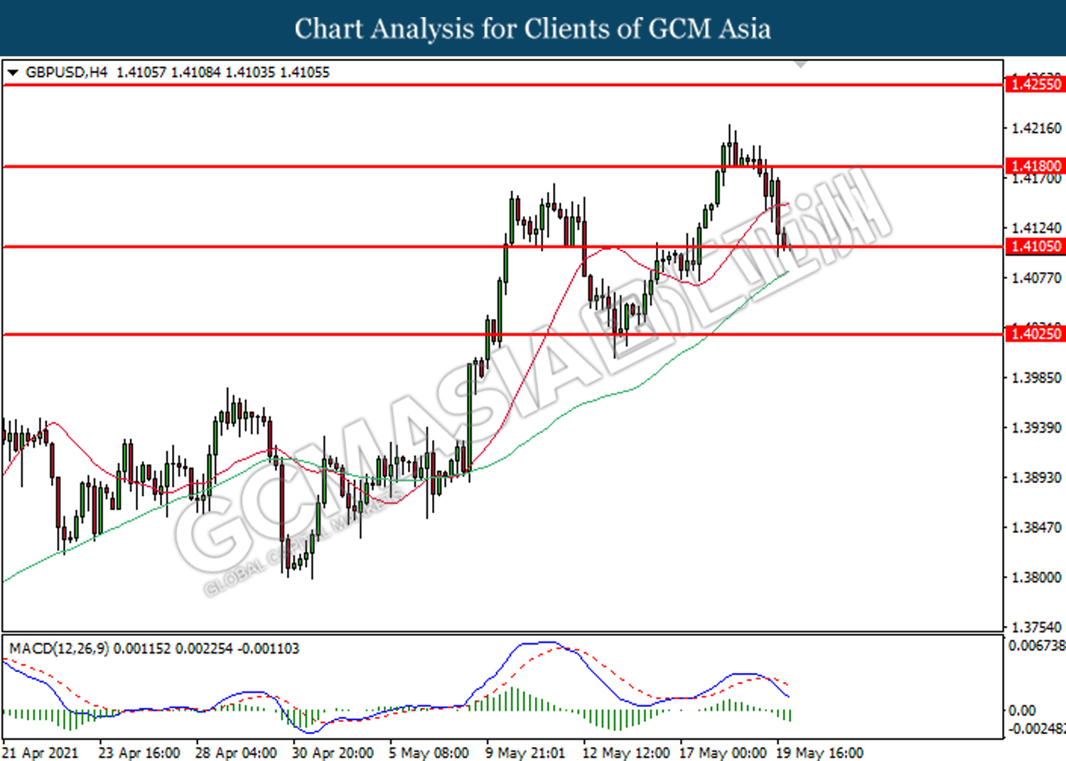 GBPUSD, H4: GBPUSD was traded lower following a retracement from 1.4180. MACD which illustrate bearish signal suggests the pair to be traded lower in short-term after closing below 1.4105.