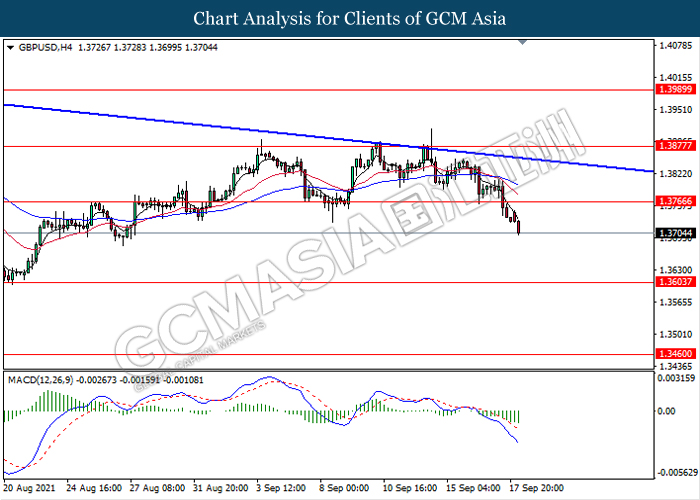 GBPUSD, H4: GBPUSD was traded lower following prior breakout below the previous support level 1.3765. MACD which illustrate ongoing bearish momentum signal suggest the pair to extend its losses towards the support level 1.3605.