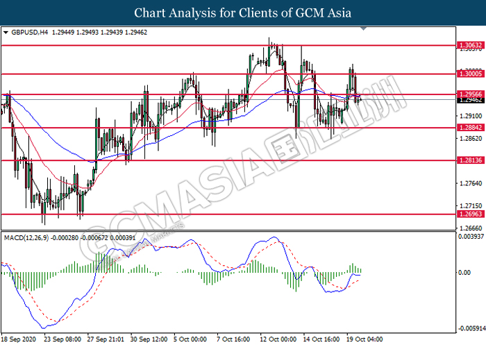 GBPUSD, H4: GBPUSD was traded lower following prior breakout below the previous support level at 1.2955. MACD which illustrates diminishing bullish momentum suggest the pair to extend its losses toward the support level at 1.2885.