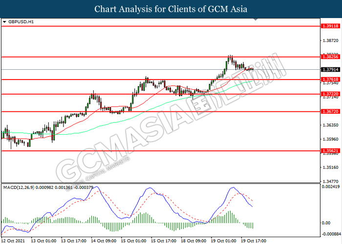 GBPUSD, H4: GBPUSD was traded lower following prior retracement from the previous resistance level at 1.3825. MACD which illustrated increasing bearish momentum suggest the pair to extend its losses toward support level at 1.3760.