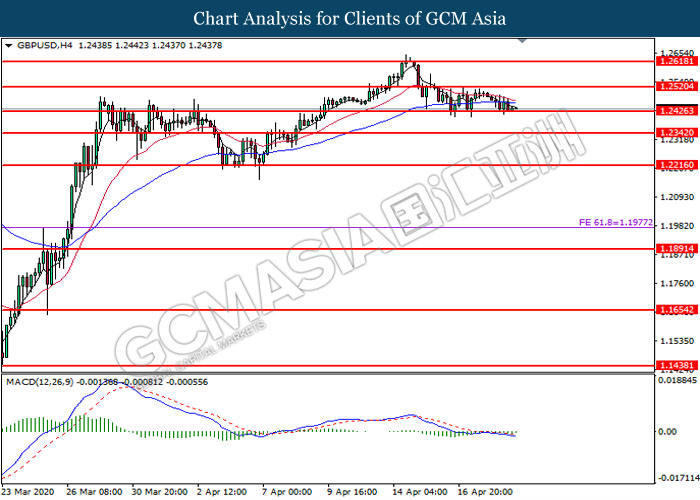 GBPUSD, H4: GBPUSD was traded lower while currently testing the support level at 1.2425. MACD which illustrate bearish bias momentum suggest the pair to extend its losses after it successfully breakout below the support level at 1.2425.