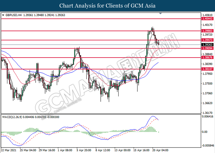 GBPUSD, H4: GBPUSD was traded lower following prior breakout below the previous support level at 1.3945. MACD which illustrated diminishing bullish momentum suggest the pair to extend its losses toward the support level at 1.3910.