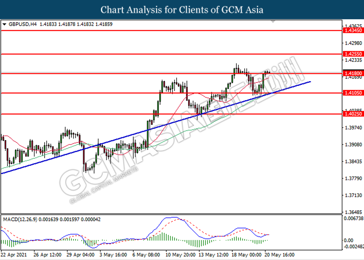 GBPUSD, H4: GBPUSD was traded lower following a rebound from 1.4105. MACD which illustrate bullish signal suggests the pair to be traded higher in short-term.