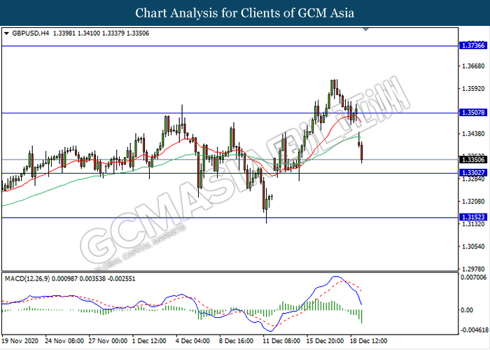 GBPUSD, H4: GBPUSD was traded lower while currently testing near the support level 1.3300. MACD which illustrate bearish momentum signal with the recent formation of death cross suggest the pair to extend its losses after it breaks below the support level.