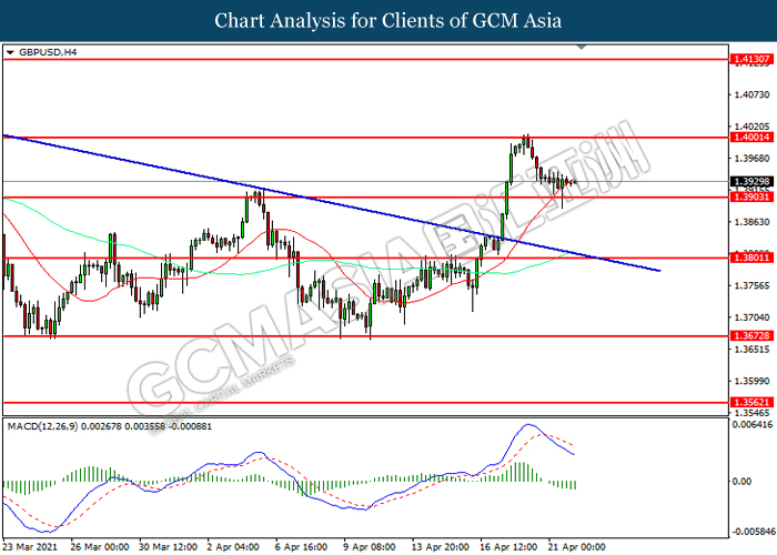 GBPUSD, H4: GBPUSD was traded lower while currently testing the support level at 1.3905. MACD which illustrated increasing bearish momentum suggest the pair to extend its losses after it successfully breakout below the support level.