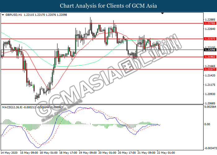 GBPUSD, H1: GBPUSD was traded lower following prior retracement from the resistance level at 1.2235. MACD which illustrated diminishing bullish momentum suggest the pair to extend its losses toward support level at 1.2190.