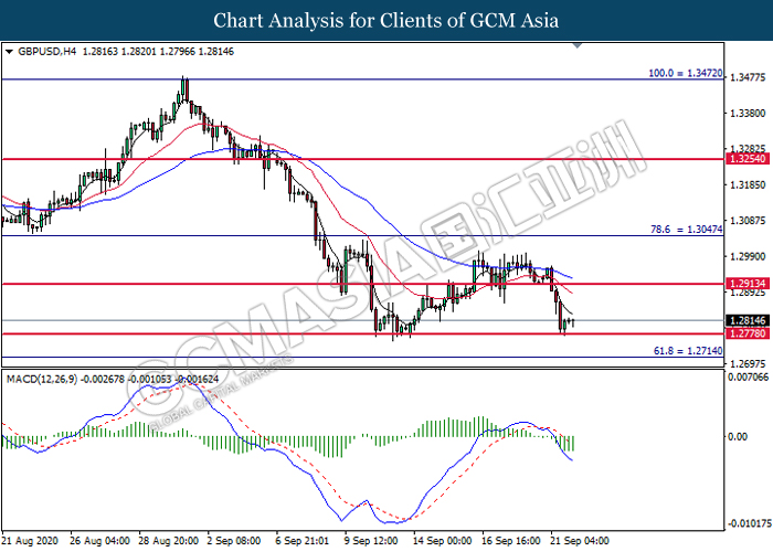 GBPUSD, H4: GBPUSD was traded higher following prior rebound from the support level at 1.2780. MACD which illustrated diminishing bearish momentum suggest the pair to extend its gains toward the resistance level at 1.2915.