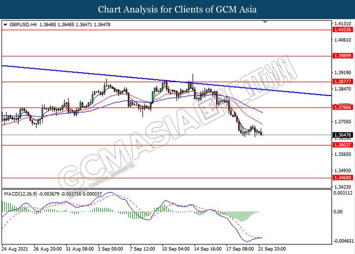 GBPUSD, H4: GBPUSD was traded lower while currently testing near the support level 1.3605. However, MACD which illustrate diminishing bearish momentum signal with the formation of golden cross suggest the pair to be traded higher towards the resistance level 1.3765.
